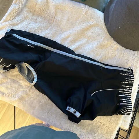 Regndress til hund fra Hurta. Fin dress med mange justeringsmuligheter. Trykknapper på bena for tilpasning. Kun brukt noen få ganger da den ble for stor for min hund. Str 60 M. Litt nupper i stoffet nederst på bena, ellers i god stand.