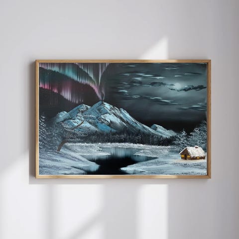 B. Brevik maleri med motiv av et fjellandskap med hytter. Maleriet er innrammet i en dekorativ ramme med detaljer i gullfarge. Signert av kunstneren B. Brevik.