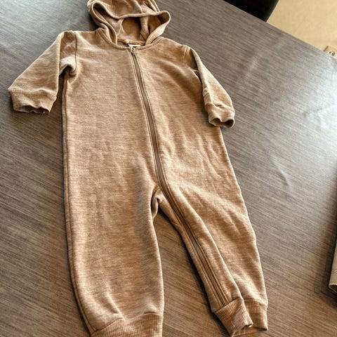 Lindex kjøledress i grå ullblanding, størrelse 74, designet for barn i unisex-stil. Dressen har hette og glidelås foran for enkel påkledning. Egnet for kalde dager for å holde barnet varmt.