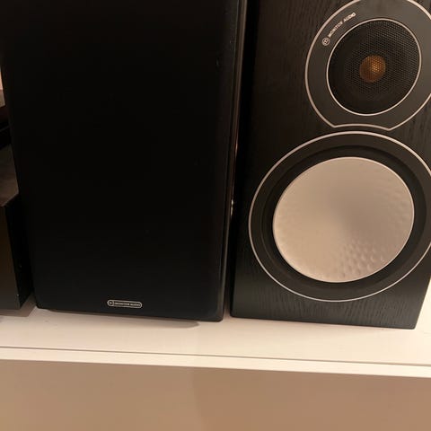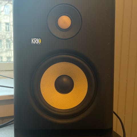 Yamaha HS7 studiemonitor høyttalere med svart kabinet og hvite basselementer. Passer for lydproduksjon og miksing i studio.