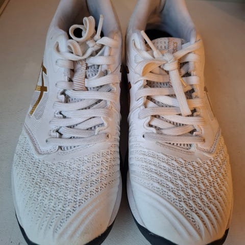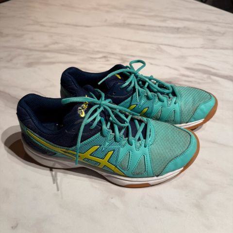Asics hall sko i størrelse 40. Farge: hvit med blå og gule detaljer. Egnet for ulike innendørs sporter