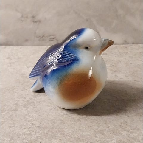 Meis, fugl dekorasjon i porselen med blå, beige og grønne fargetoner. Glassert overflate. H 7,8 cm, L 10 cm. Fått i gave for over 40 år siden. Fremstår som ny uten skader. Sendes mot porto.