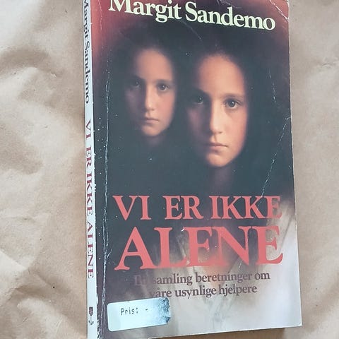 Margit Sandemo Vi er ikke alene Bok. Inneholder samling beretninger om usynlige vesener. Utgitt av Bladkompaniet A/S.