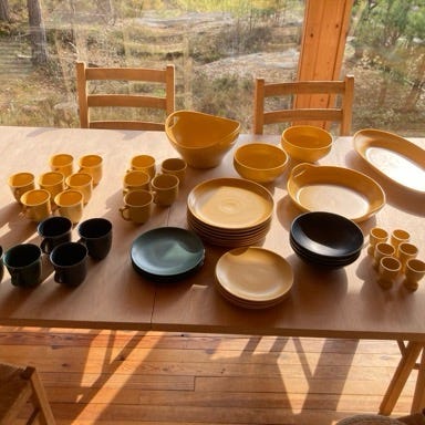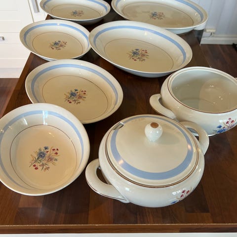 Selger 8 asjetter 20cm - og 8 tefat 12cm samlet . Finner ikke koppene 🥹 Vi rydder - er på flyttefot. Finner ikke koppene til serviset, men selger asjett og tefat til kaffekoppen. Kanskje har du kopper , men mangler dette? 😆 Dette er godt brukt her hjemme , så litt bruksmerker kan det være , men alle delene er hele uten nagg. Selges samlet.