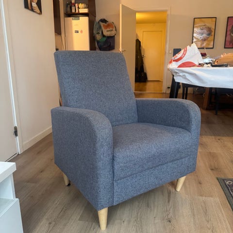 Selger en blå stol med puff, kan ikke lenes bakover, men kan jynges.