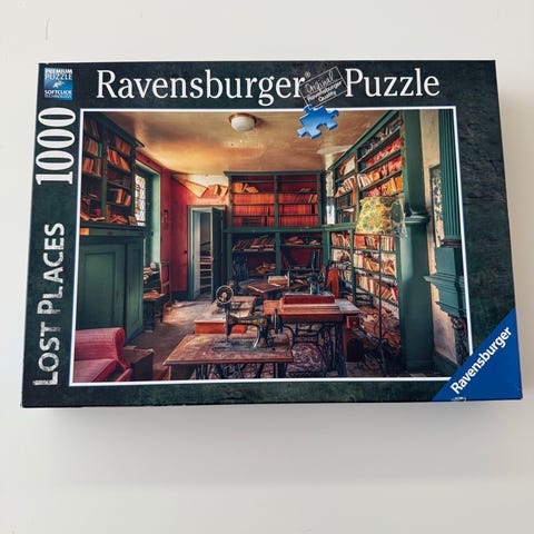 Ravensburger Lost Places puslespill med 1000 brikker. Puslespillet har et motiv av et forlatt rom med detaljerte elementer. Passer for voksne og eldre barn som liker puslespill med utfordrende motiv.