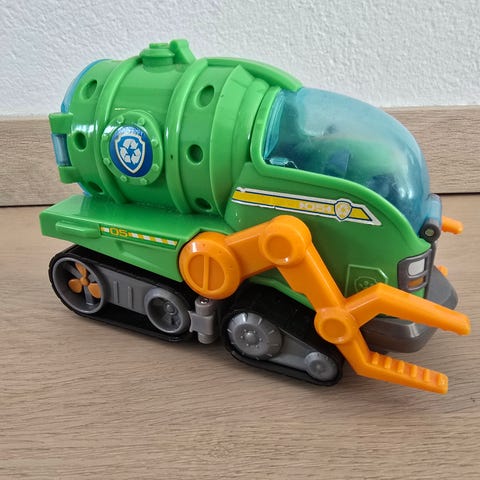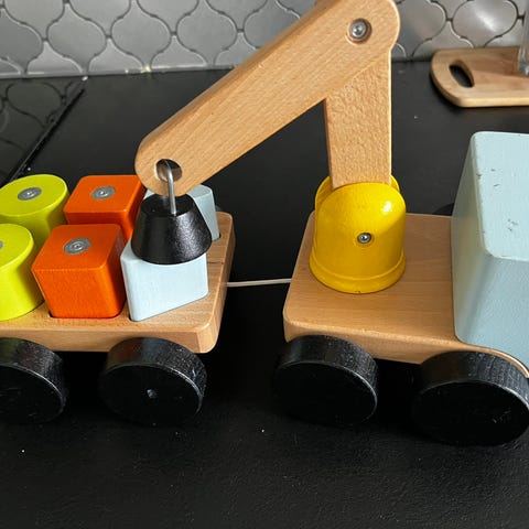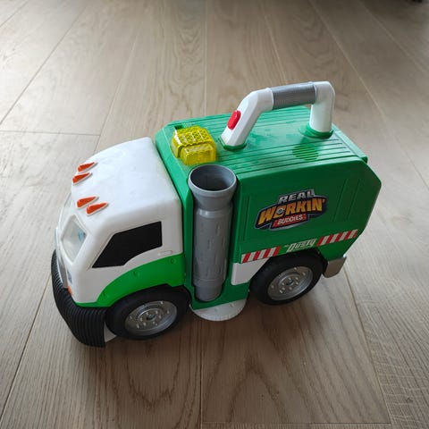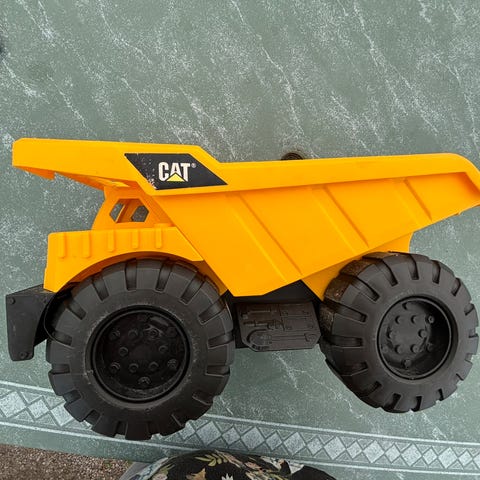CAT lekebil i gul og svart plast. Designet som en robust leke for barn. Den kan åpnes og noen deler kan demonteres og monteres på nytt.