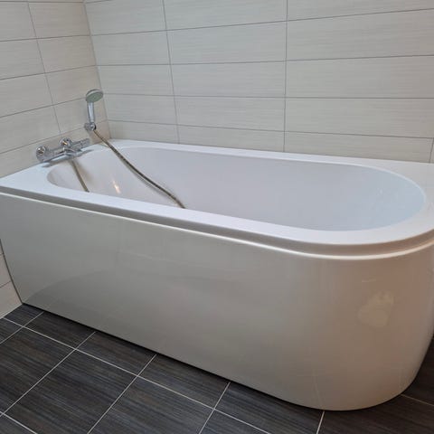 Hvitt badekar med dusj vegg selges. Egnet for både dusj- og badeløsninger. Ca. 8 år gammelt.