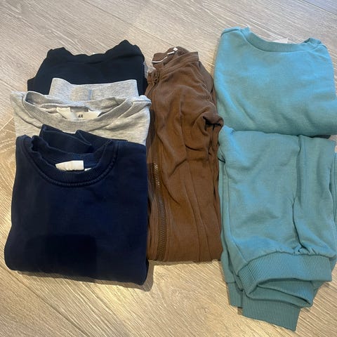 Liten klespakke str 98-104. Ett sett med bukse+genser og to andre bukser.
