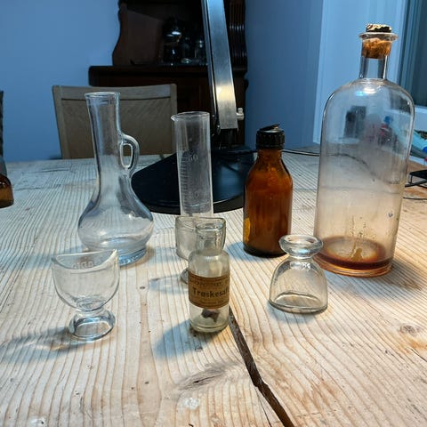 3 stk rustikke, dekorative og velholdte, vintage medisinflasker.