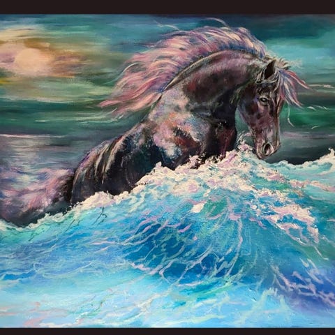 Maleriet har mye struktur som gir unik dybde med sterk grønn og rød/oransje farger, som i Nordlyset. Malte kanter og kan henges rett på veggen. Kan sendes i posten