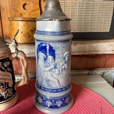 Steingods / fajanse-kanne. Bondepar i folkedrakt. 23cm høy