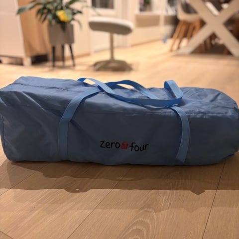 Carena reiseseng i svart farge. Egnet for barn og designet for enkel transport og bruk ved reiser. Noen bruksflekker. Ca 125 cm lang og ca 65 cm bred. Overmadrass medfølger