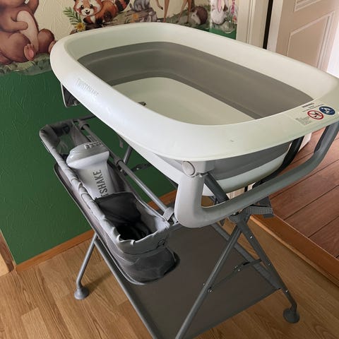 Pent brukt badebalje med stativ. Stativet er sammenleggbart.