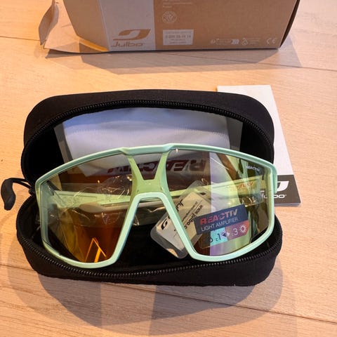 Julbo brebrille i Legacy-serien med svart spectron-glass. Brillene har avtakbare sidebeskyttere, en antiskli nesebro og stenger som kan justeres. Ut fra hva jeg ser, er de ikke blitt tilpasset tidligere.