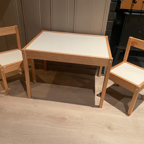 IKEA barnemøbel bord med oppbevaringsbokser og gul stol