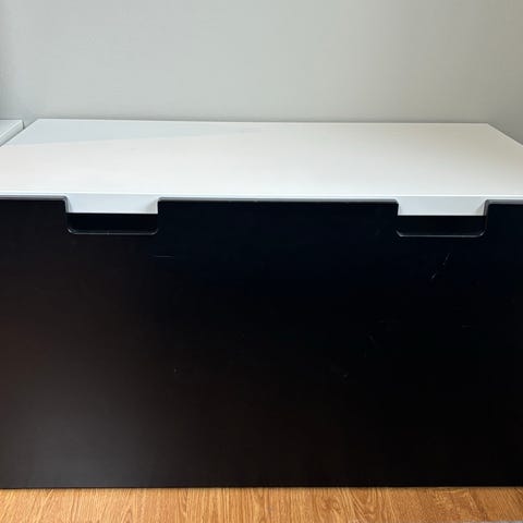 IKEA barnemøbel som inkluderer et bord med to hvite lokk og innebygde oppbevaringsbokser i grønn og gul plast. Noen bruksmerker finnes.