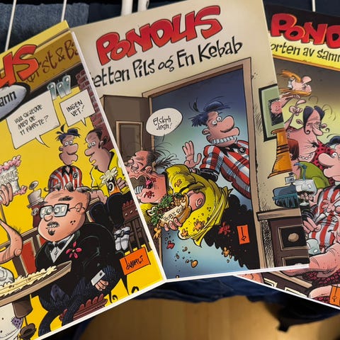 Pondus tegneseriehefter med nummer 9 og 0-6. Inneholder humoristiske historier og illustrasjoner fra serien Pondus. Begge bøkene er ubladd. 300 kr for begge,eller 200 pr stk