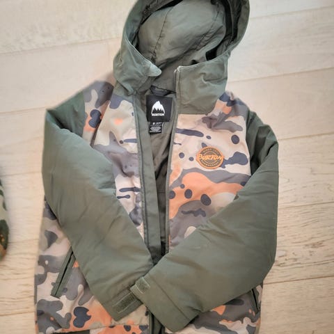 Selger en blå Burton vinterjakke i str S( 7-8 år, 122) Det stoffet man drar i til glidelåsen har blitt ødelagt. Har erstattet den med en trå. Fungerer helt fint.