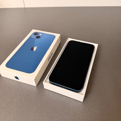 Apple iPhone 13 med 128 GB lagringskapasitet i blå farge. Telefonen har en kompakt størrelse og leveres med gjennomsiktig beskyttelsesdeksel og skjermbeskytter. Batterikapasiteten er på 90% maksimal ytelse.