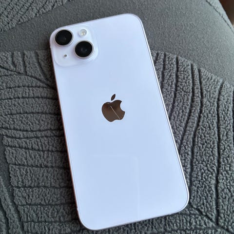 Apple iPhone 14 mobiltelefon med 128 GB lagringskapasitet i rød farge. 85% batterikapasitet.