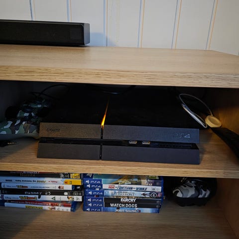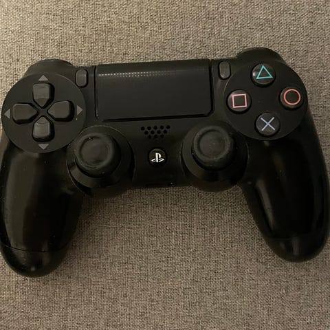 Sony DualShock 4 trådløs kontroller i svart farge. Designet for bruk med PlayStation-konsoller, utstyrt med analoge spaker, retningstaster, og standard knapper for spillkontroll.