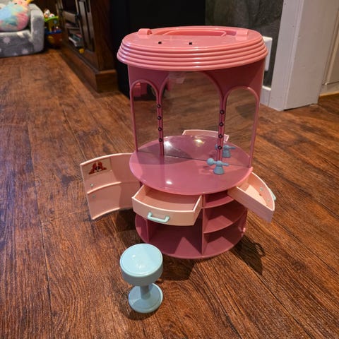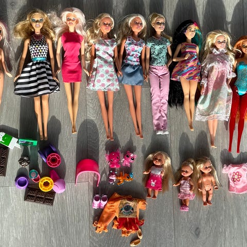 Ulike dukker med tilhørende barbie garderobeskap i rosa. Settet inkluderer flere dukker, kjoler og et skap med transparent dør, egnet for lek og oppbevaring av dukketilbehør.