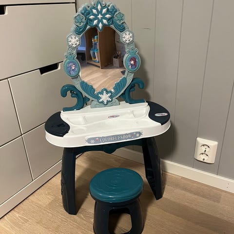 Sminkebord med speil, inkludert liten stol å sitte på.