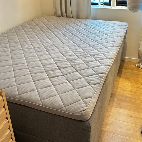 150 x 200 cm Jensen seng selges. Har stått på gjesterom. Sengen står på en ramme helt nedpå bakken. Todelt ramme nederst og hel madrass over. Selges uten overmadrass.
