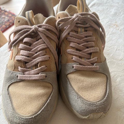 Vans Sneakers joggesko i størrelse 40 med beige farge. Skoene har rund skotupp, flat hælform og snøring som lukking. Mønsteret er ensfarget. Yttersålen er antiskli og profilert, og skoene har funksjoner som vanntett og pustende materiale. Ekstra detaljer inkluderer gripetunge og hæltunge. Innersålen er polstret og avtagbar. Brukt 3 gang, selges pga feil størrelse
