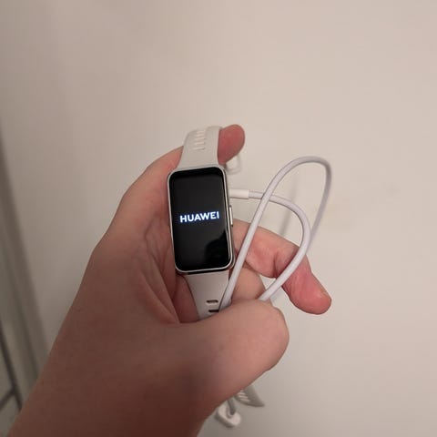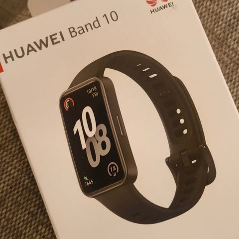 Huawei Band 10 aktivitetsarmbånd i rosa farge. Enhet med rektangulært display og justerbart armbånd i silikonmateriale. Designet for bruk på håndleddet. Kjøpt ny høsten -25.