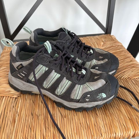The North Face fottursko i størrelse 41, designet for fottur. Skoene har en slitesterk konstruksjon med solid såle for godt grep på variert terreng. Fargene inkluderer svart med turkise detaljer.