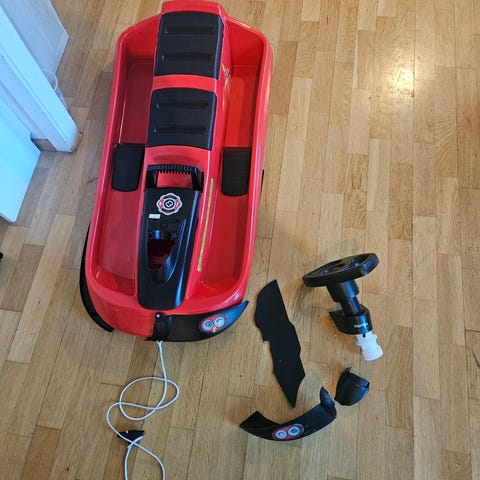 Rødt akebrett med ratt, gis bort.