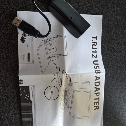 Telenor router med tilbehør inkludert strømadapter, nettverkskabler og manual. Enheten er beregnet for bredbåndstilkobling og har flere LAN-porter for kablet nettverkstilgang.