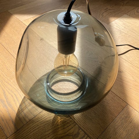 IKEA taklampe med glasskuppel. Lampen har en rund, gjennomsiktig glasskjerm som gir et moderne og minimalistisk uttrykk. Passer til oppheng i tak og gir et indirekte lys. Kan ikke sende da jeg har ikke emballasje å pakke i. Har også en gulvlampe i samme stil som er også til salgs.