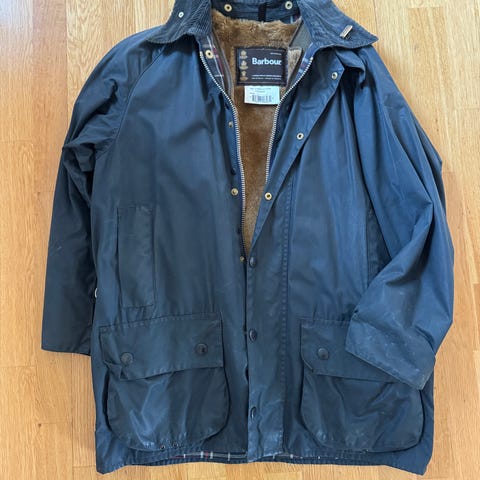 En godt brukt barbour som trenger en lappejobb. Fin patina, godt brukt. Blå