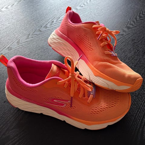 Skoene har en rosa farge og er designet for løping og daglig bruk. Materialet og konstruksjonen gir god støtte og komfort.