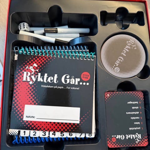 Ryktet Går brettspill for voksne, spill som kombinerer visking og tegning på papir. Passer for aldersgruppen 18 år og oppover.