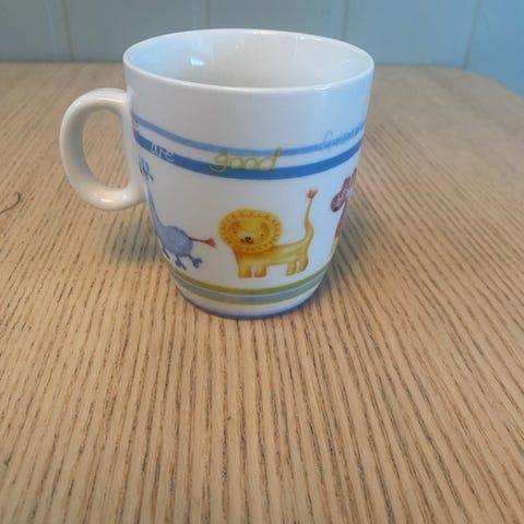Fint barnekrus med små bruksspor et lite skall borte under kruset litt mørkt nederst på kruset ( er nok slitasje av at det er vasket og brukt)Fint inni ingen krakelering