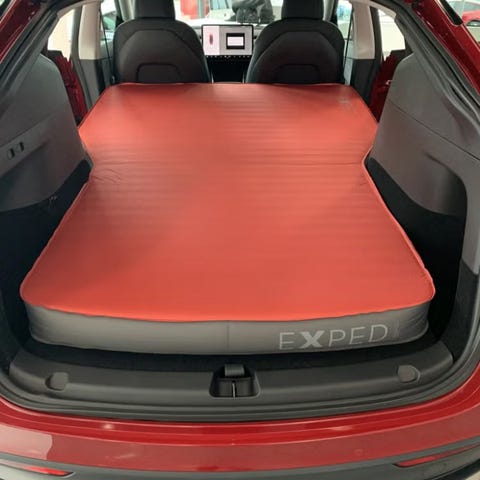 Tesla, Tesla Model Y, Tesla Model 3, bilcamping, camping i bil, car camping, overnatting i bil, campingmadrass, bilmadrass, Tesla madrass, Havnby, roadtrip, elbil, friluftsliv, biltur, sove i bil, oppblåsbar madrass, bagasjerom, bakseter ned, tilpasset madrass