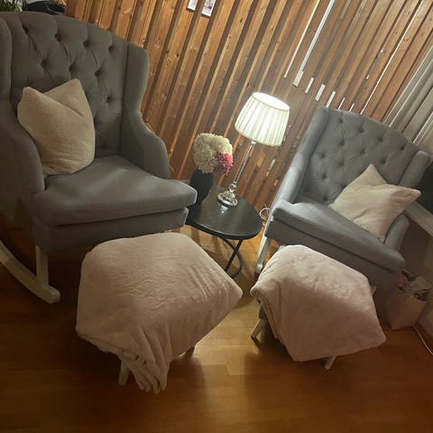 Stolen har noe slitasje på armlenet. Det følger med et beige trekk dersom det er ønskelig.