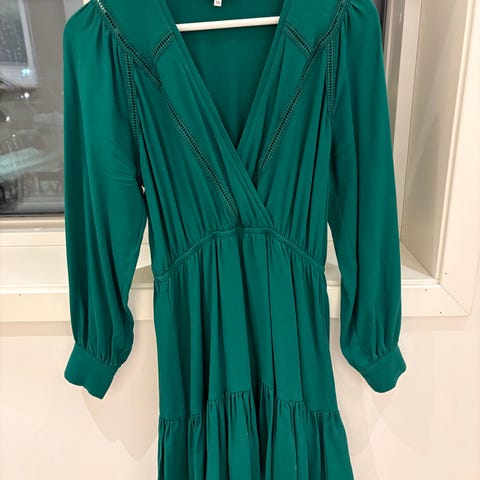 En kjole med 3/4 ermer, rund hals og rysjedetaljer. Fleksibelt bånd i linningen, knappelukking i halsen og folder på overdel og i skjørt.