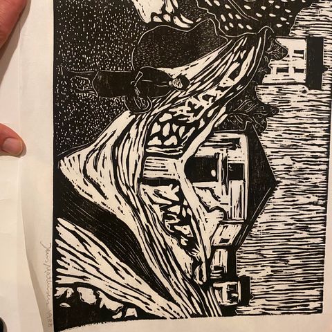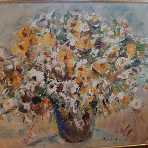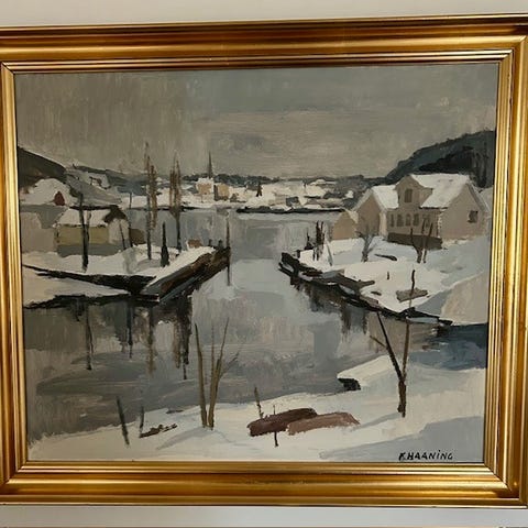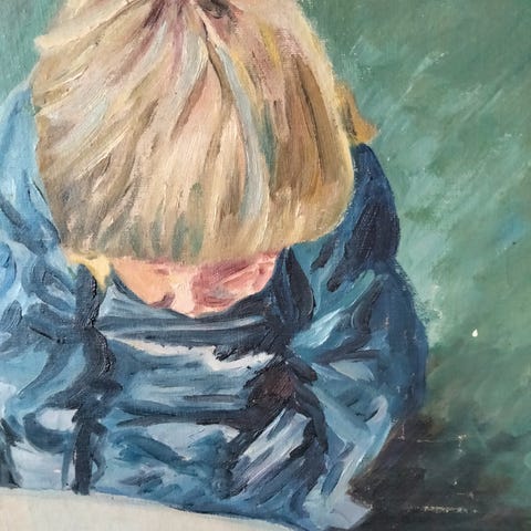 Bak kan det se ut som det står noe på K, deretter navnet hennes og 1970. Trolig oljemaleri