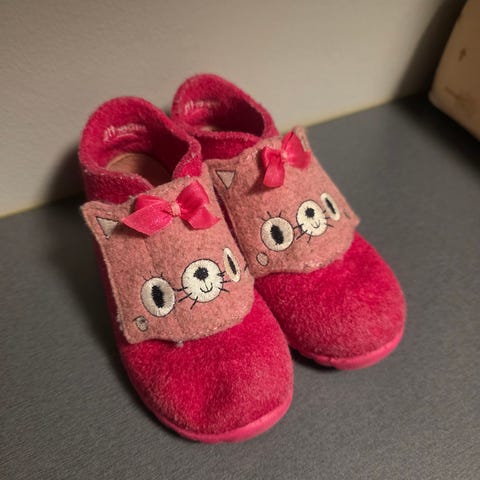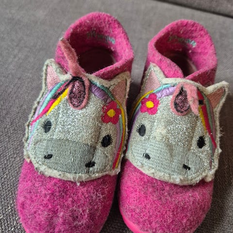 Pent brukte rosa ulltøfler med enhjørning i str 26.