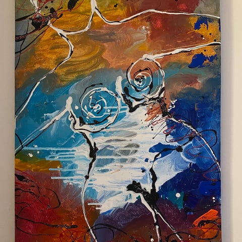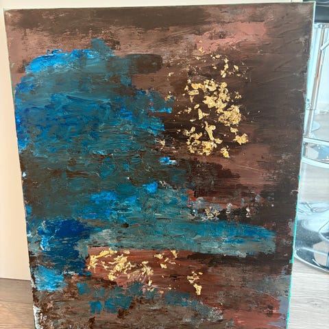 Abstrakt maleri med hovedfarger i lilla og gull. Maleriet har en dynamisk og fargerik komposisjon med ulike nyanser og teksturer. Egnet som dekorasjon i ulike rom.