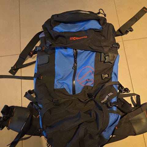 Stormberg tursekk med 55 liters kapasitet i blå og svart farge. Sekken har flere lommer og justerbare stropper for komfort og tilpasning. Egnet for friluftsliv og turer, laget i slitesterkt materiale.