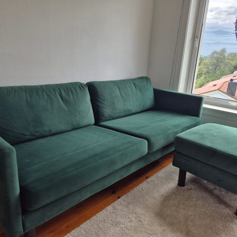 Olivengrønn 3-seters sofa i fløyelsstoff. Sofaen har rette armlener og flere puter for komfort. Passer til stue eller oppholdsrom. Kjøpt i 2018 på Bohus. Pent brukt.