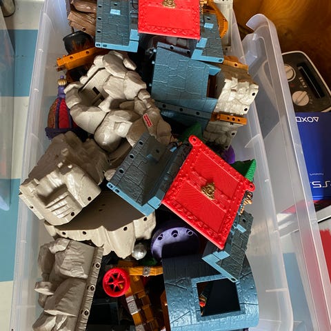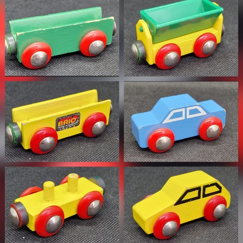 Brio togbane med diverse skinner, togstasjon (trenger batteri), tunnel som åpnes ved å trykke på en knapp, flere togsett og et batteridrevet lokomotiv.