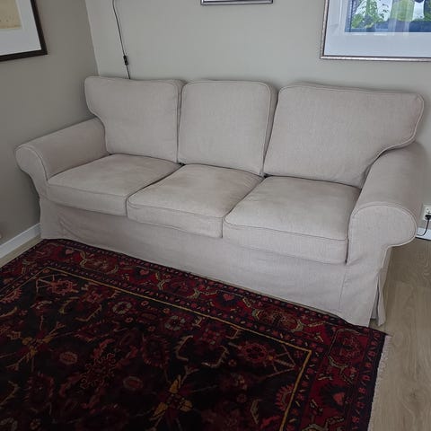 Selger to fine Ektorp 3 setere, i lys beige tekstil med sort kontur søm. Veldig gode og behagelige og sitte i.