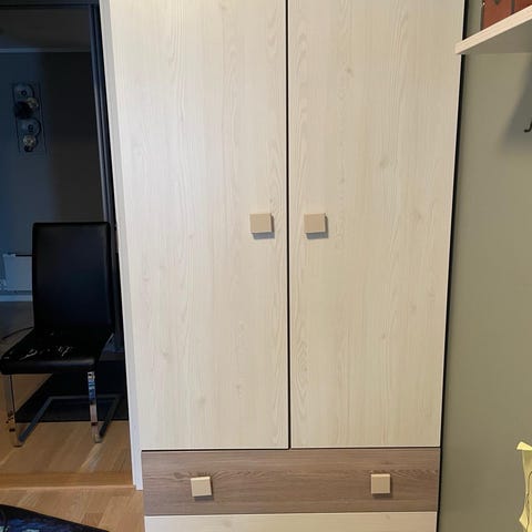 Pent brukt garderobeskap fra IKEA, plasta. Den øverste delen er satt på så uten skuffene på toppen er den 180 høy.